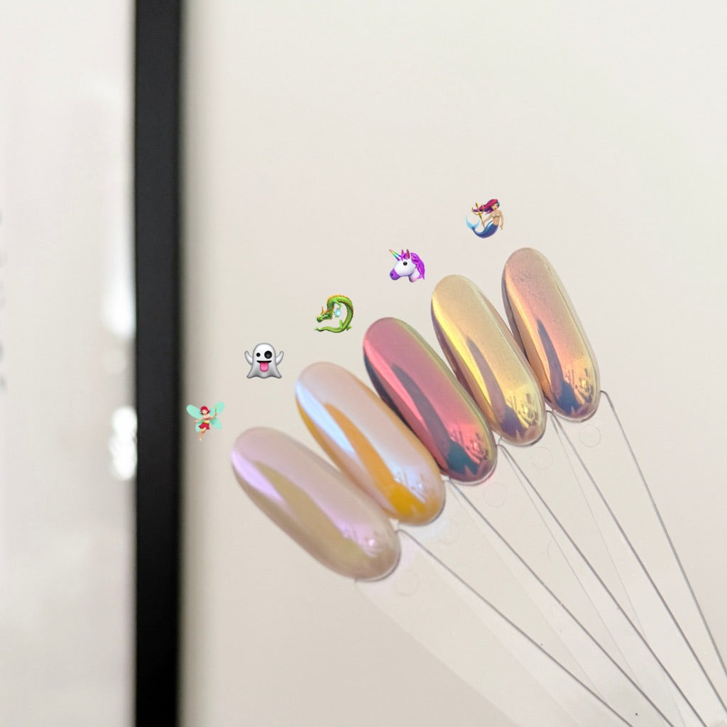 Polvere sottilissima per un leggero effetto perla dai riflessi dorati. La polvere ha una coprenza media, stesa su colori chiari dona un leggero tono violetto.